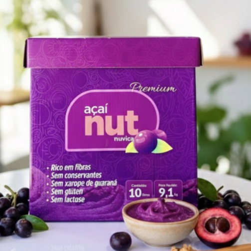Açaí Nut 100% natural em caixa com 10 litros (9,2 kg). Rico em fibras, antioxidantes e nutrientes como ferro, fósforo, potássio, vitaminas C, B1 e B2. Sem xarope de Guaraná Sem conservantes Sem glúten, lactose ou gordura trans Vegano e adoçado com açúcar cristal Ideal para revenda ou consumo em família. Textura cremosa, sabor intenso e qualidade premium direto do fabricante.