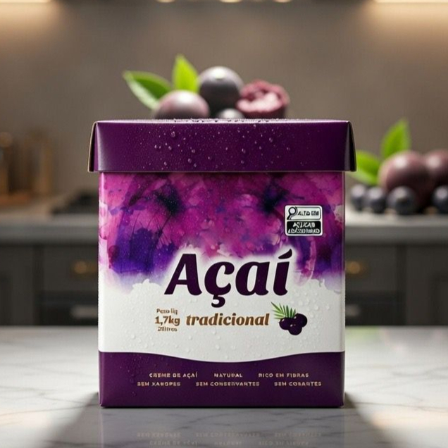 Açaí Nut 100% natural em caixa com 2 litros (1,7 kg). Rico em fibras, antioxidantes e nutrientes como ferro, fósforo, potássio, vitaminas C, B1 e B2. Sem xarope de Guaraná Sem conservantes Sem glúten, lactose ou gordura trans Vegano e adoçado com açúcar cristal Textura cremosa, sabor intenso e qualidade premium direto do fabricante.