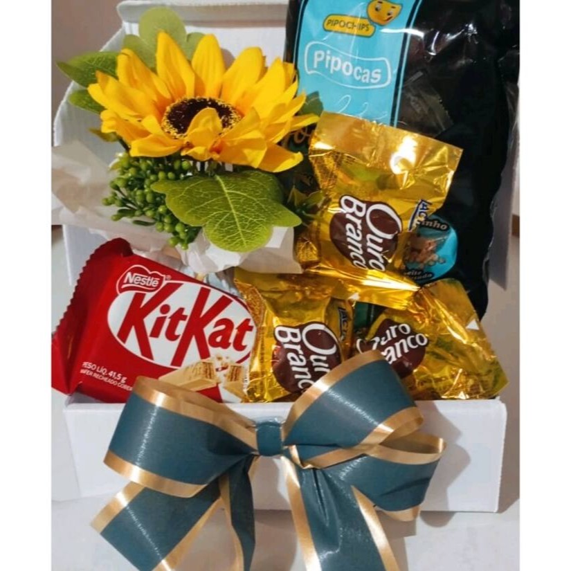 Apresentada em uma embalagem refinada, com balão metálico elegante, laço dourado trabalhado e um mini arranjo floral que transforma o presente em um verdadeiro mimo visual e afetivo.