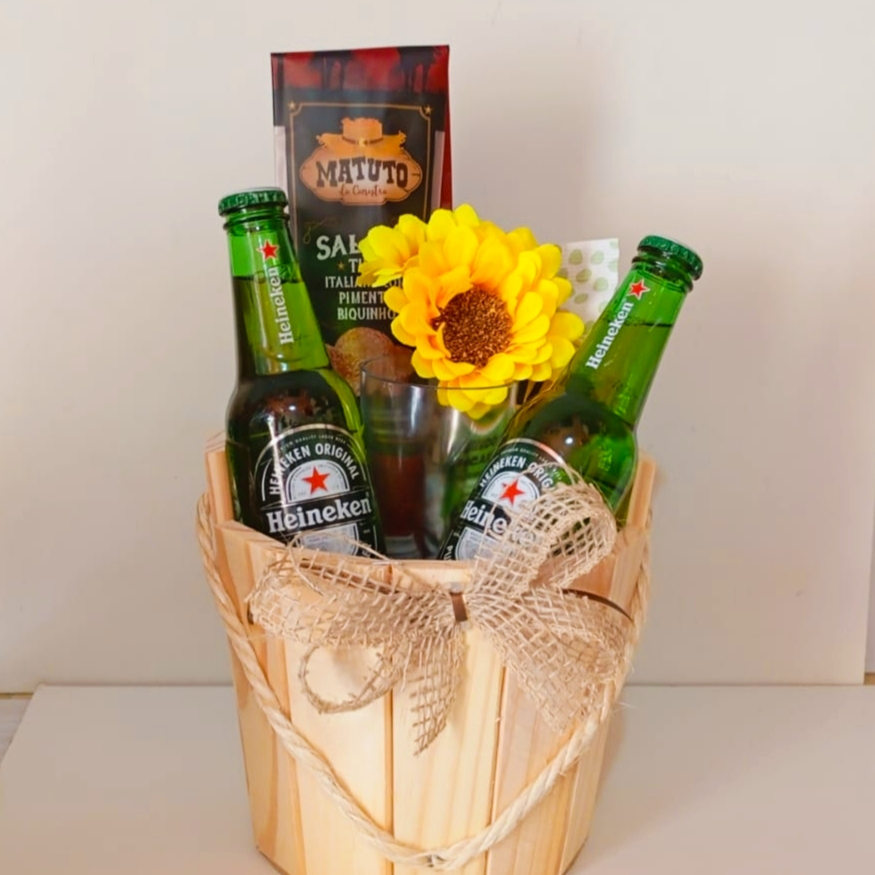 Um presente que une bom gosto, sabor e charme rústico. Ideal para quem aprecia momentos especiais, essa cesta é perfeita para aniversários, datas comemorativas ou simplesmente para surpreender alguém querido. ✨ Contém: 🍺 2 cervejas Heineken long neck 🥩 Salame italiano Matuto 🥃 Copo de vidro 🌻 Flor decorativa que traz alegria e sofisticação 🪵 Caixa de madeira rústica decorada com laço artesanal 🎁 Um presente pronto para encantar, com visual elegante e combinação perfeita para um happy hour inesquecível.