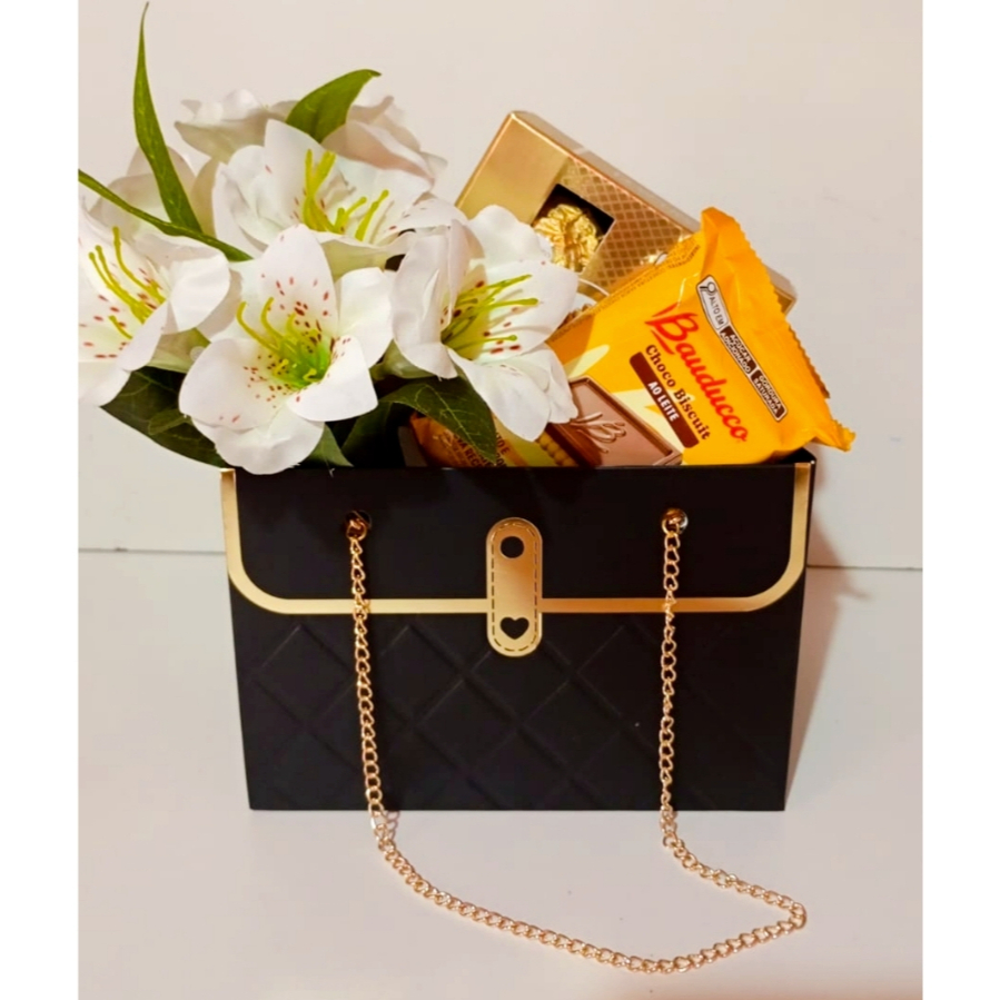 Um presente que é puro charme e sofisticação! 💛 Essa cesta em formato elegante de bolsa, com acabamento preto matelassado e detalhes dourados, é simplesmente apaixonante. Um verdadeiro luxo que impressiona antes mesmo de abrir! 🎁 Contém: 🍫 Deliciosos bombons Ferrero Rocher 🍪 Biscoito recheado de chocolate 🍫 Barra de chocolate 🌸 Lindas flores artificiais que dão um toque romântico e sofisticado Perfeita para surpreender em aniversários, datas especiais, pedidos românticos ou para encantar alguém sem precisar de motivo. 💎 Um presente que une sabor, beleza e requinte em uma única composição. Encante, surpreenda e marque presença com essa bolsa que é puro glamour! 💕