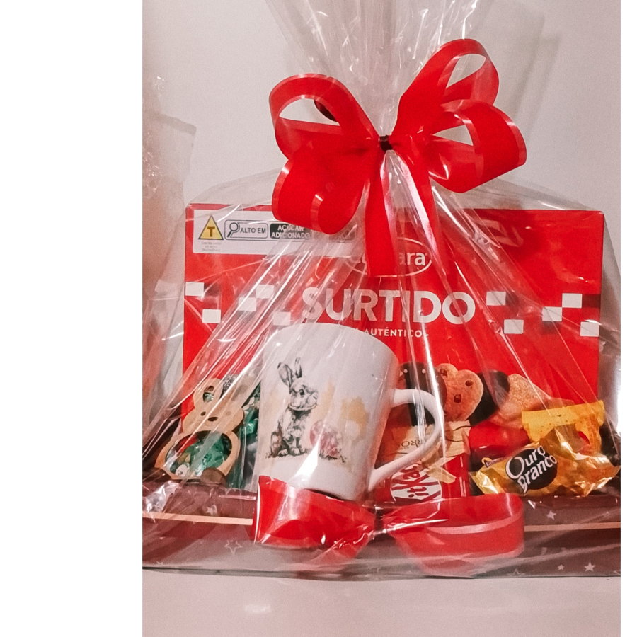 Surpreenda quem você ama com a nossa Cesta Especial de Delícias! Unimos marcas clássicas e um toque artesanal para criar um presente que encanta os olhos e o paladar. Perfeita para presentear amigos, familiares ou aquela pessoa especial. O que vem na cesta: Caneca Exclusiva: Com uma estampa fofíssima de coelhinho, ideal para aquele café ou chocolate quente aconchegante. Caixa de biscoitos finos Sortidos: Uma variedade de sabores para todos os gostos. Mimos Extras: Inclui KitKat e o queridinho Ouro Branco. Decoração Impecável: Montada em uma base decorada, embalada em celofane transparente e finalizada com um laço vermelho luxuoso.