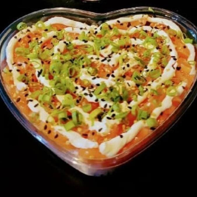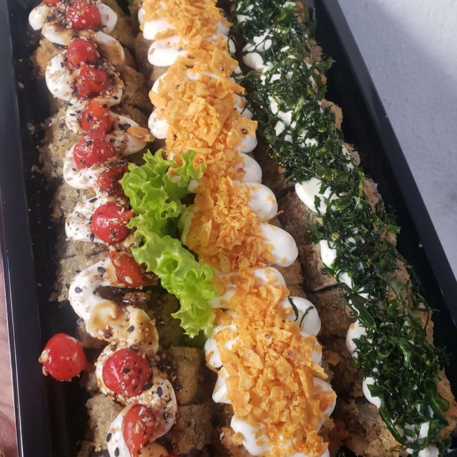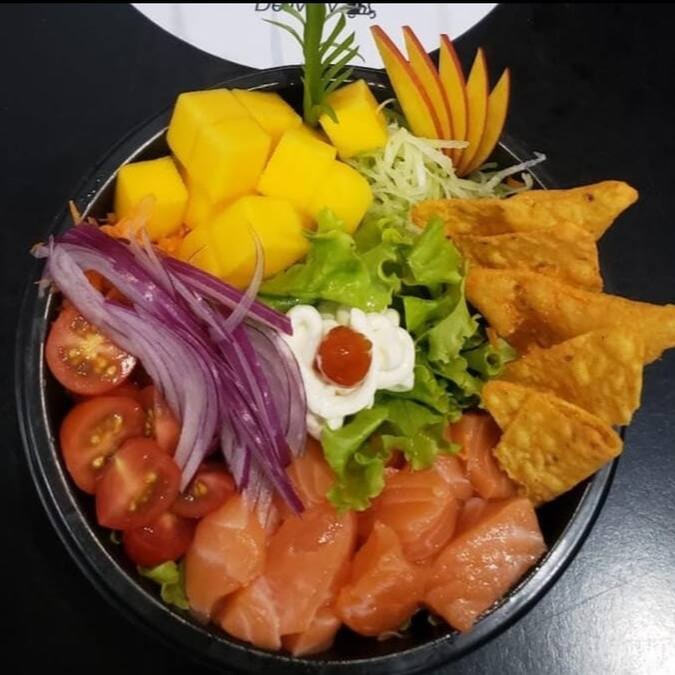 Base arroz japones salmao alface manga tomate cebola roxa Doritos cream chesse