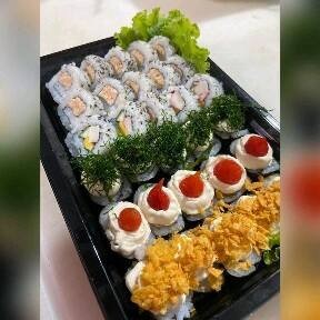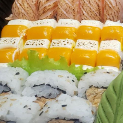 Base arroz japones salmao cream cheese cebolinha (filadelfia)alface cenoura manga couve crocante cebola roxa pepino