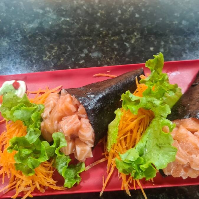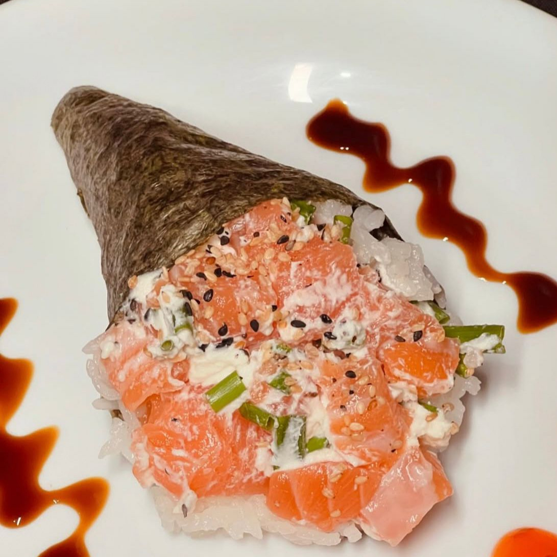 Temaki Filadélfia --> Arroz, salmão, cream cheese e cebolinha