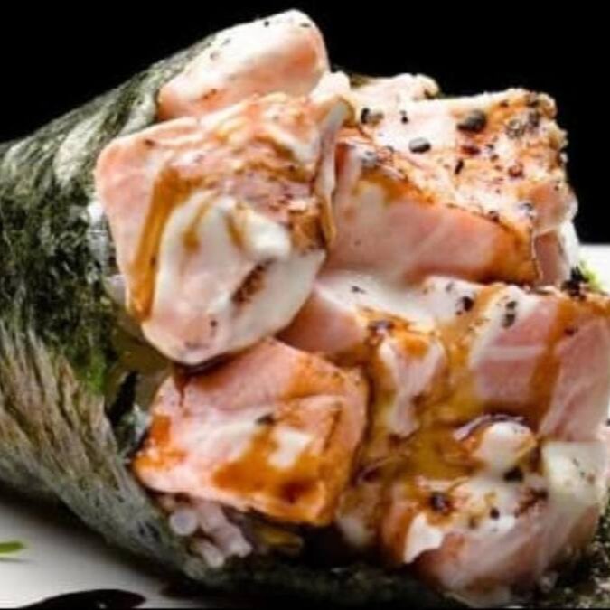 Temaki salmão grelhado --> Arroz e salmão maçaricado