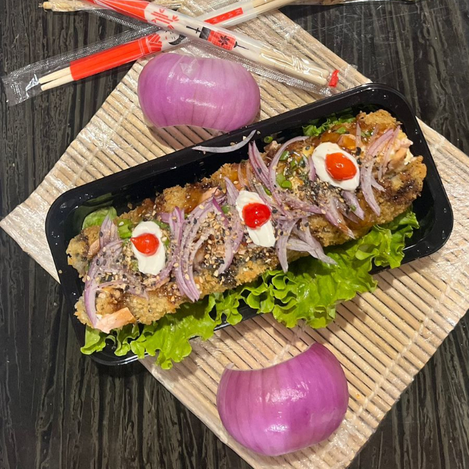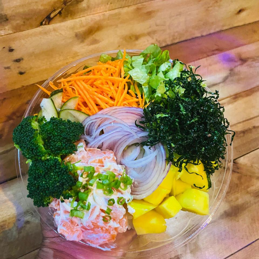 Arroz japonês alface furai de salmão tomate manga cebola roxa pepino creme creesse