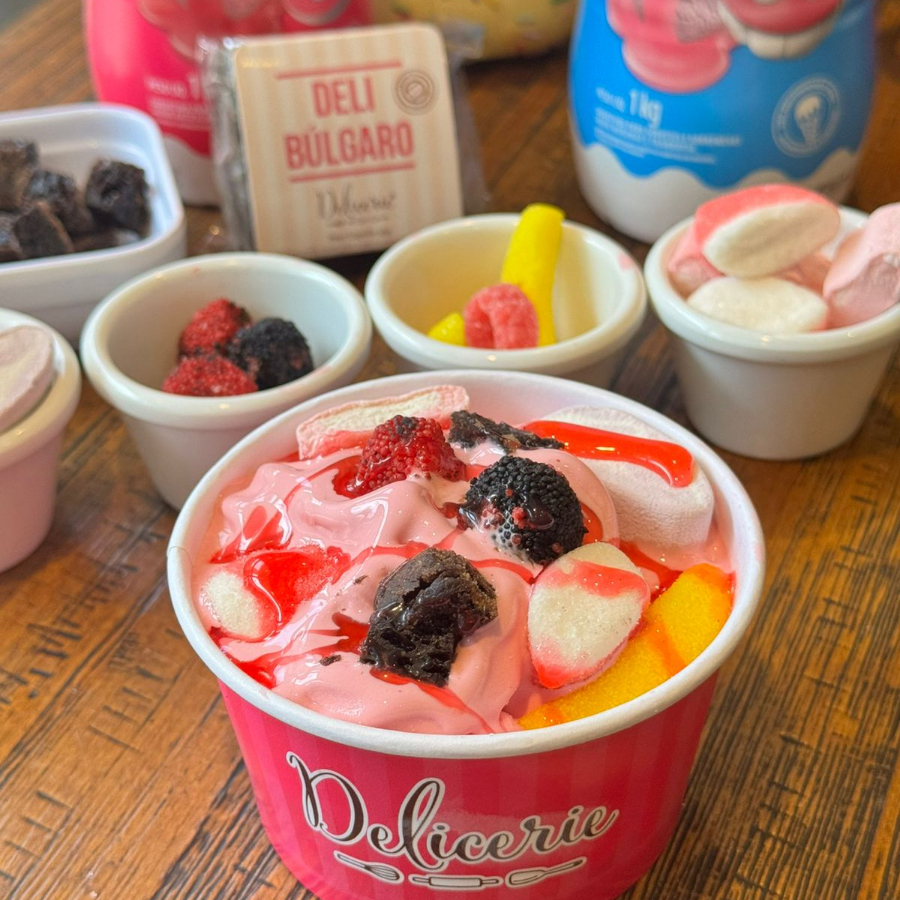 Base Búlgaro, Sorvete de Morango, Balas Fini e Calda Fini de Beijo.