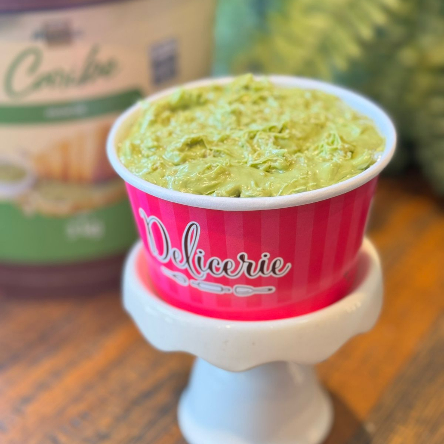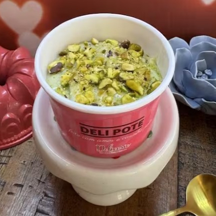 Bolo no pote com camadas de bolo de baunilha super macio, intercaladas com ganache cremosa de chocolate branco. Finalizado com uma generosa porção de recheio crocante de pistache, que traz textura e sabor marcante a cada colherada. Um doce elegante e irresistível!