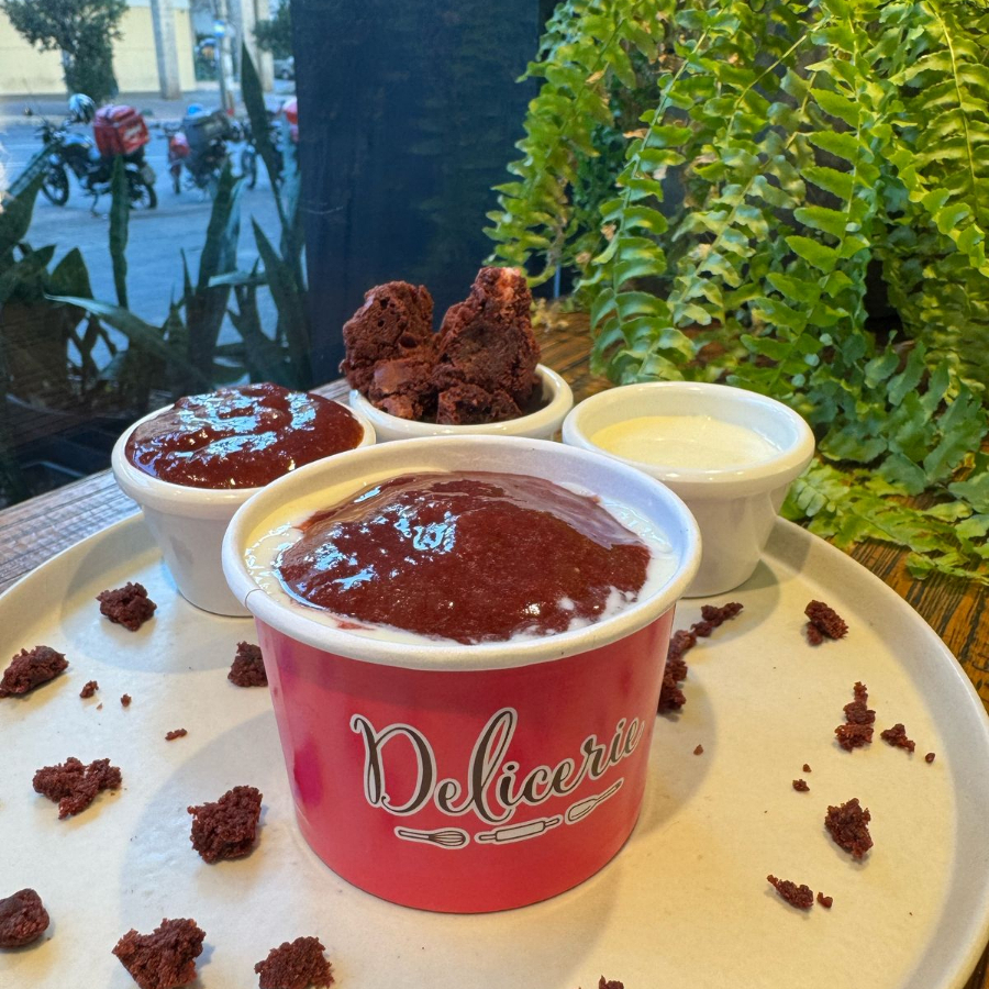 Nosso amado Brownie de Red Velvet afogado em uma deliciosa calda de cream cheese e geleia de morango. Uma explosão de sabores ao paladar.