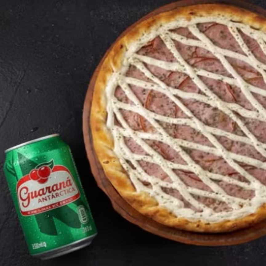 4 fatias! Preparada com massa artesanal, assada no ponto certo, com molho de tomate caseiro, muçarela derretida e ingredientes selecionados. Escolha seu sabor favorito e aproveite uma refeição completa, perfeita para o almoço ou jantar. 1 Pizza Media + Guaraná Antártica Lata 350ml