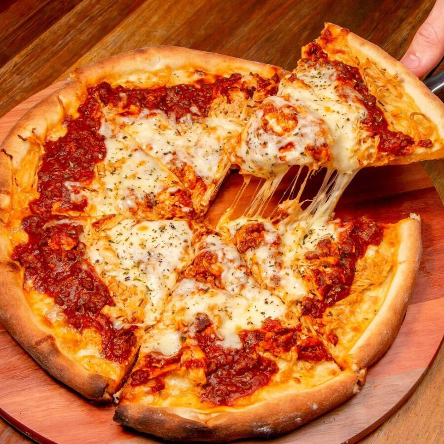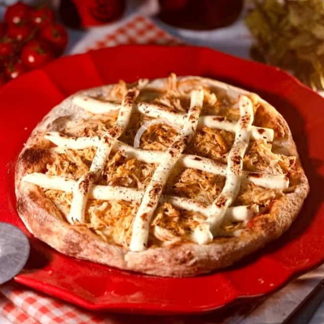 Pizza de frango desfiado temperado com nossa receita especial da casa, coberta com Catupiry Original derretido. Massa artesanal, borda crocante e recheio cremoso que derrete na boca! Ideal para o almoço ou jantar.