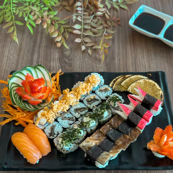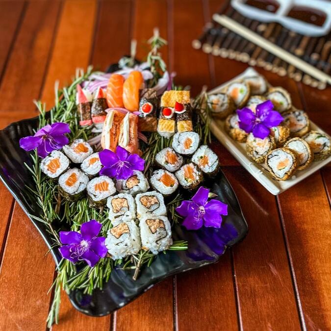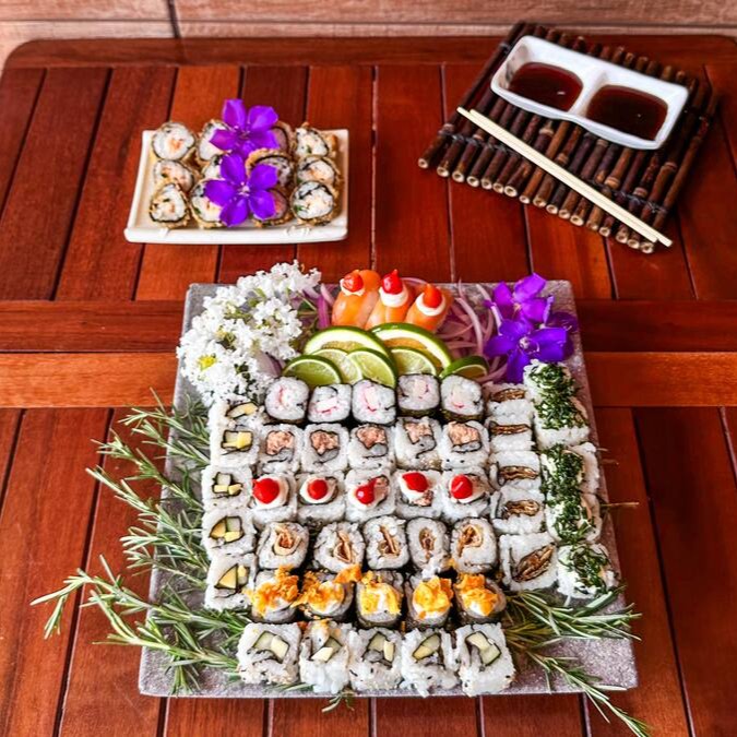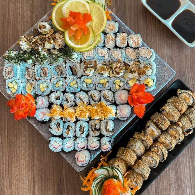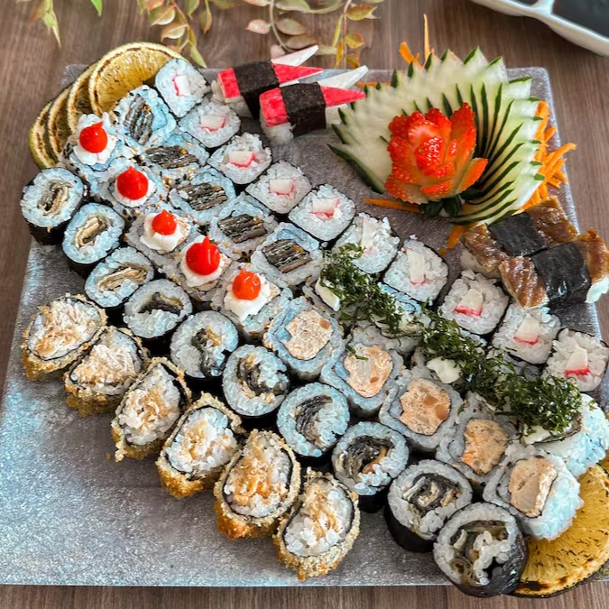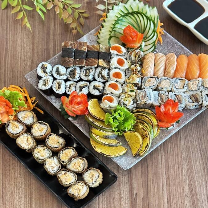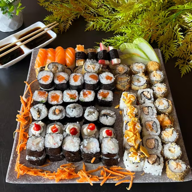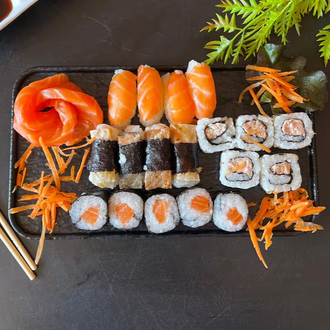 2 niguiri skin, 2 niguiri kani, 10 maki skin , 1o maki kani, 10 ura grelhado, 10ura skin, 6 hot