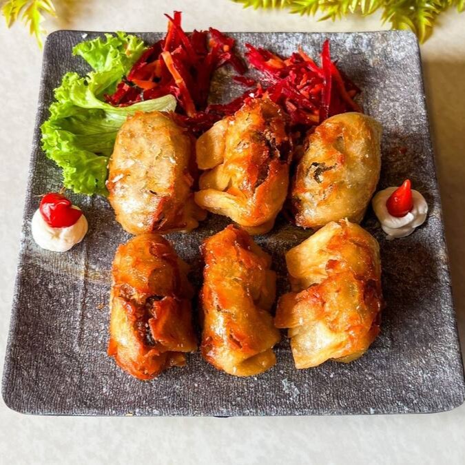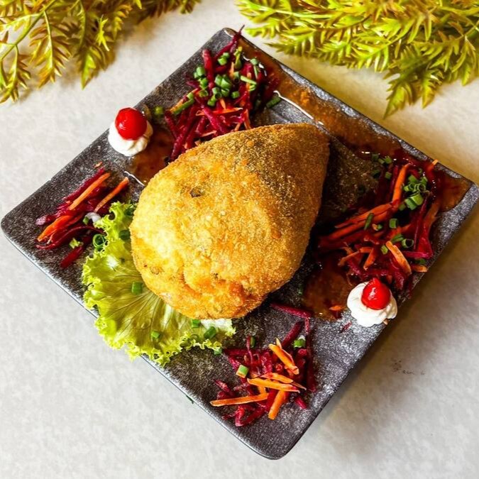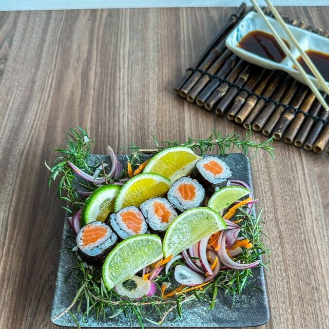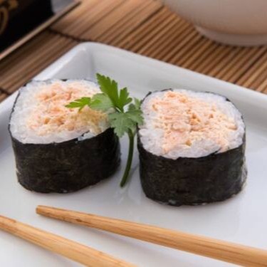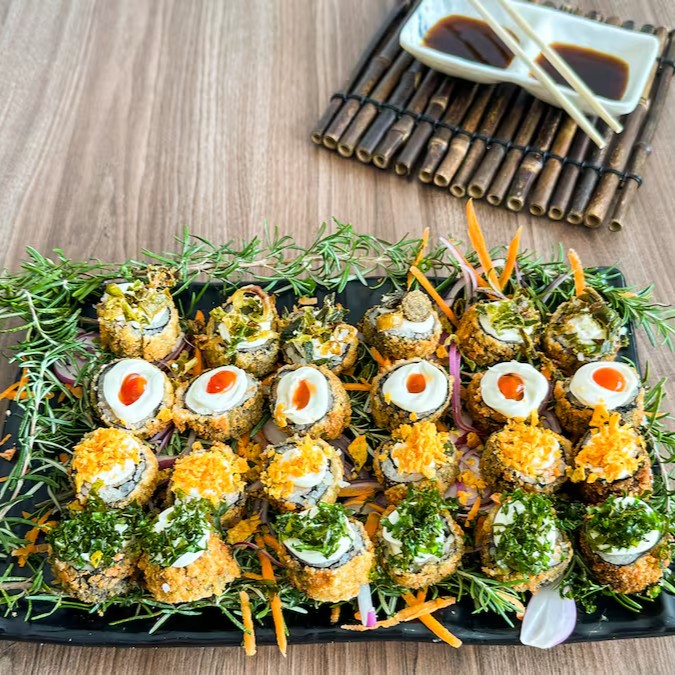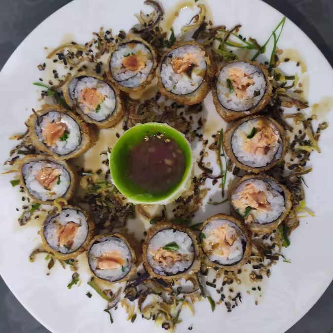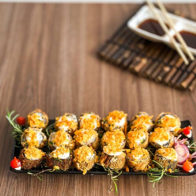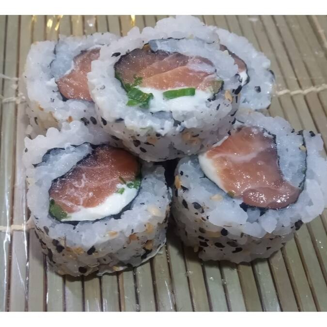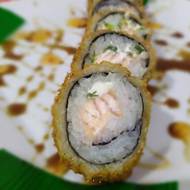 Maki de salmão com cream cheese e cebolinha, empanado com farinha especial e frito.