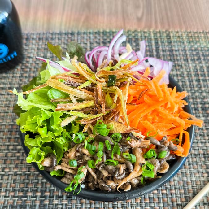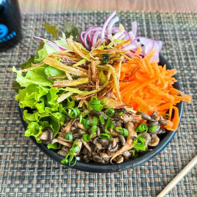 Arroz japones ,shimejiv ,mix de folhas ,Cebola Roxa,Cenoura, alho poró