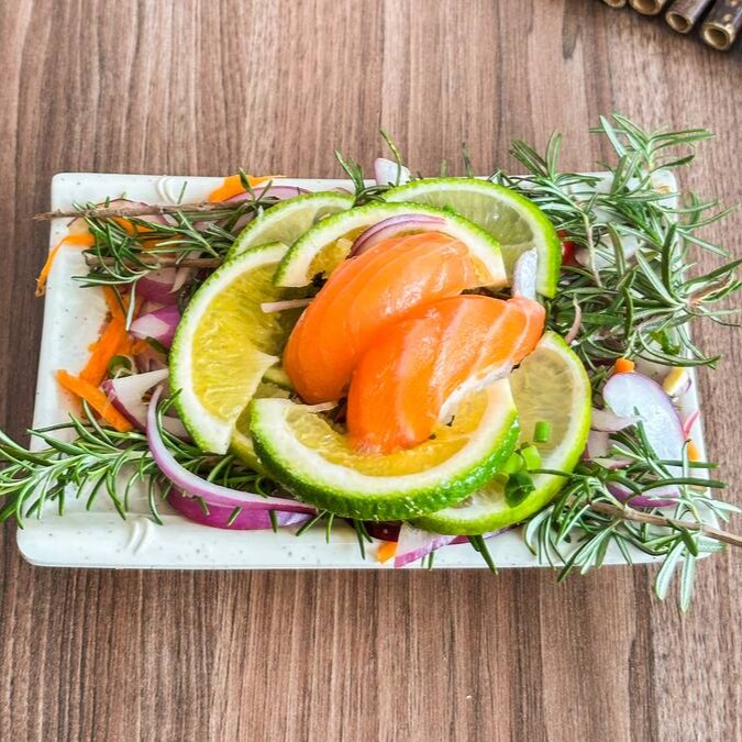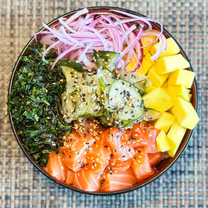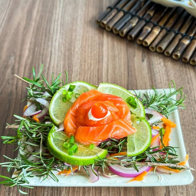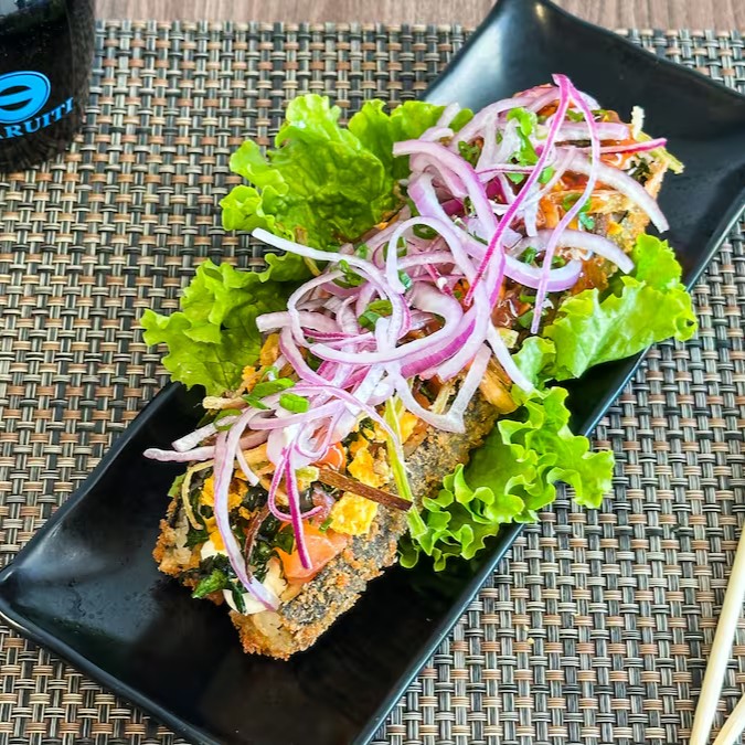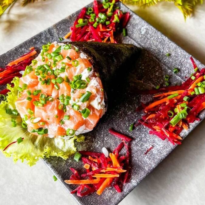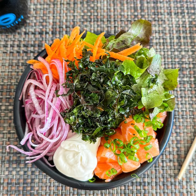 Arroz japonês ,salmão , creme cheese, mix de folhas , cenoura , cebola roxa , crispy de couve