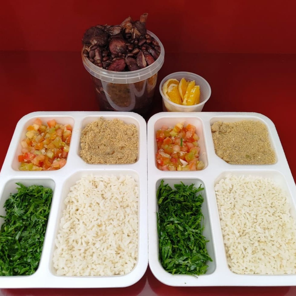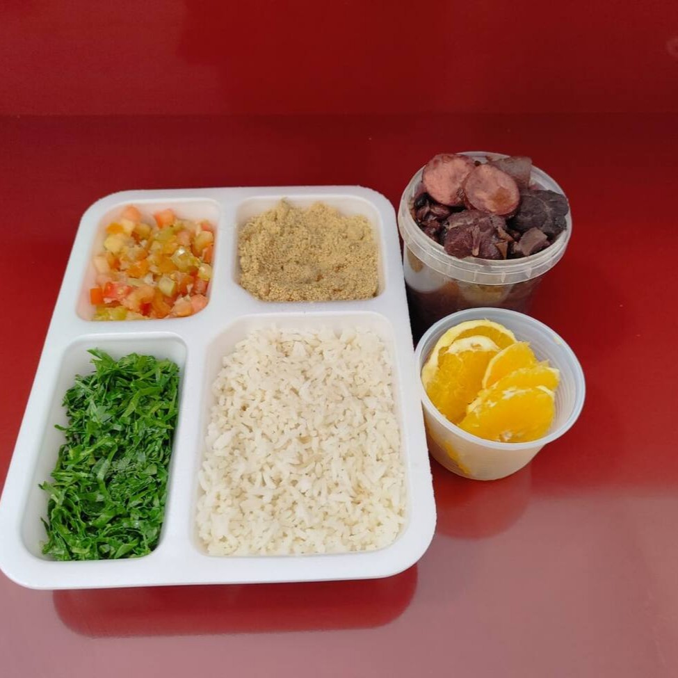 Marmita de Feijoada completa, acompanha arroz, couve, farofa, laranja e vinagrete Marmitex de 500ml