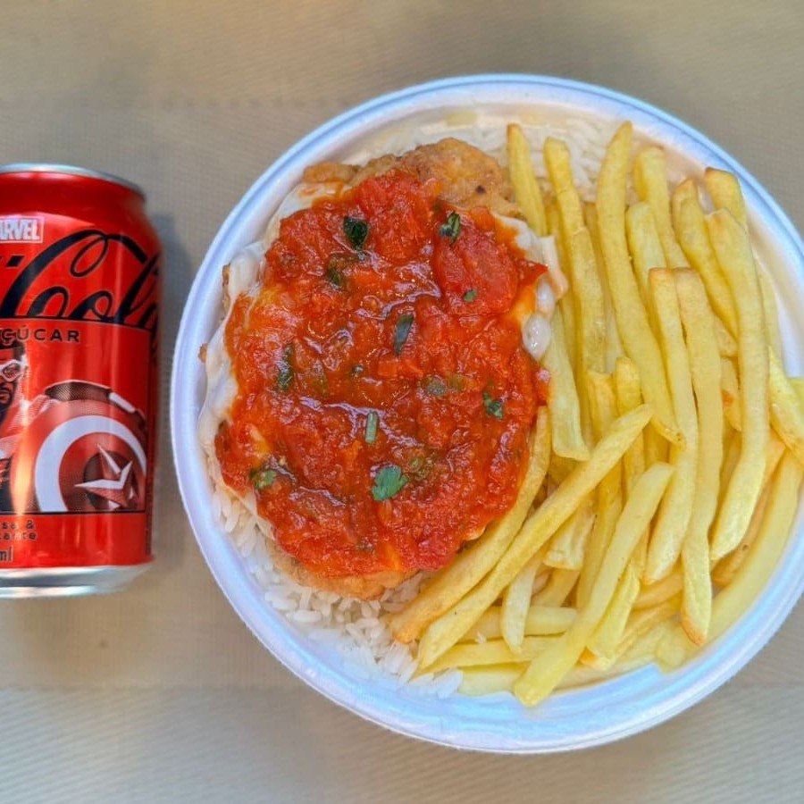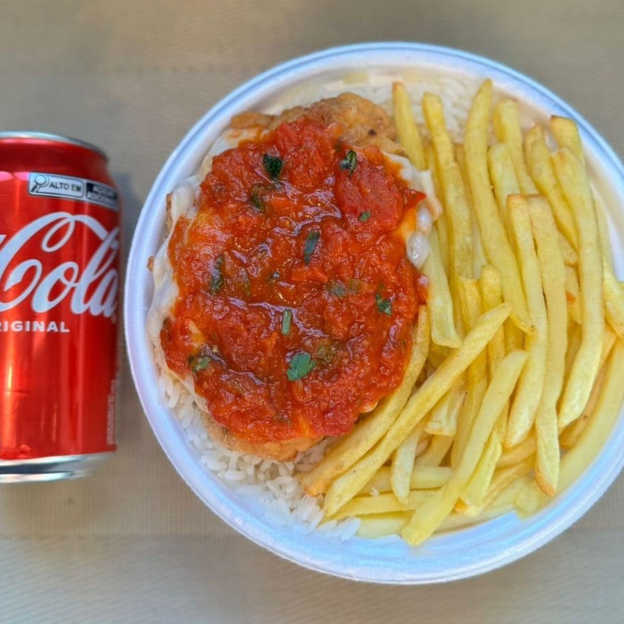 Marmita com delicioso filé de frango parmegiana (empanado na massa crocante coberto com molho de tomates e queijo) acompanhado de arroz branco e batatas fritas. Acompanha refrigerante lata Coca Cola 350ml bem gelada. Marmita indicada para 01 pessoa.