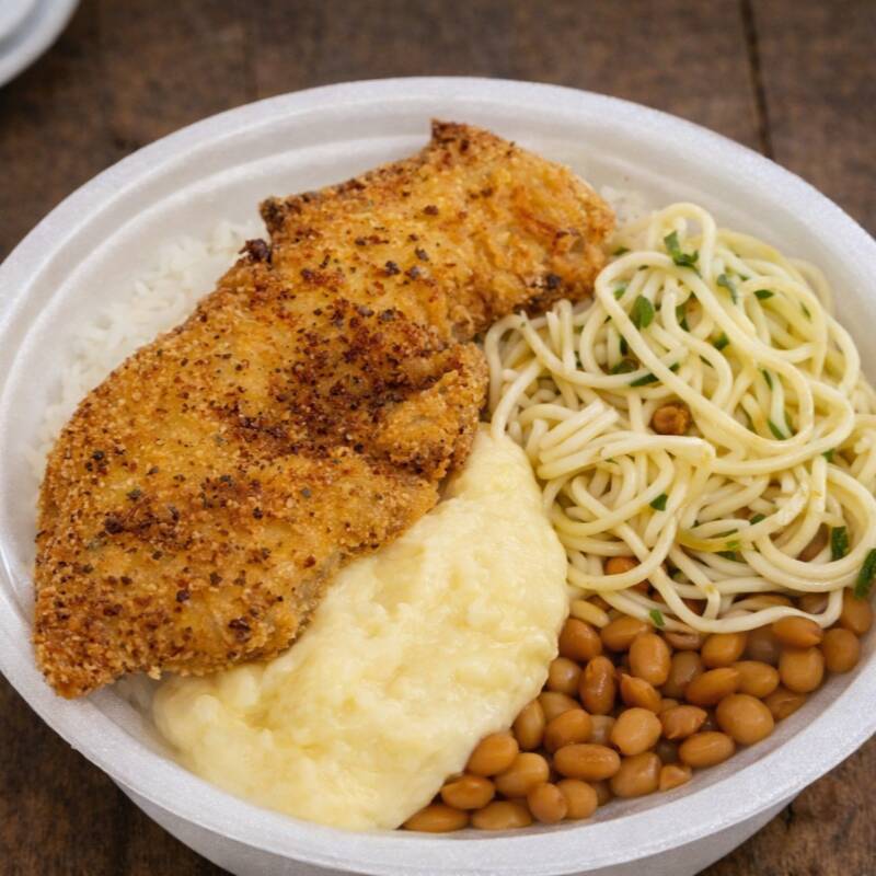 Arroz , feijão , purê de batata , macarrão alho e óleo e frango a milanesa.