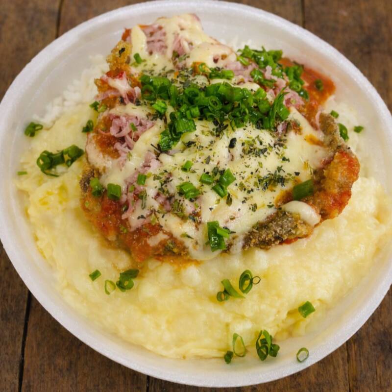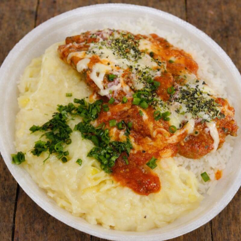 Arroz, purê de batata e frango a parmegiana .