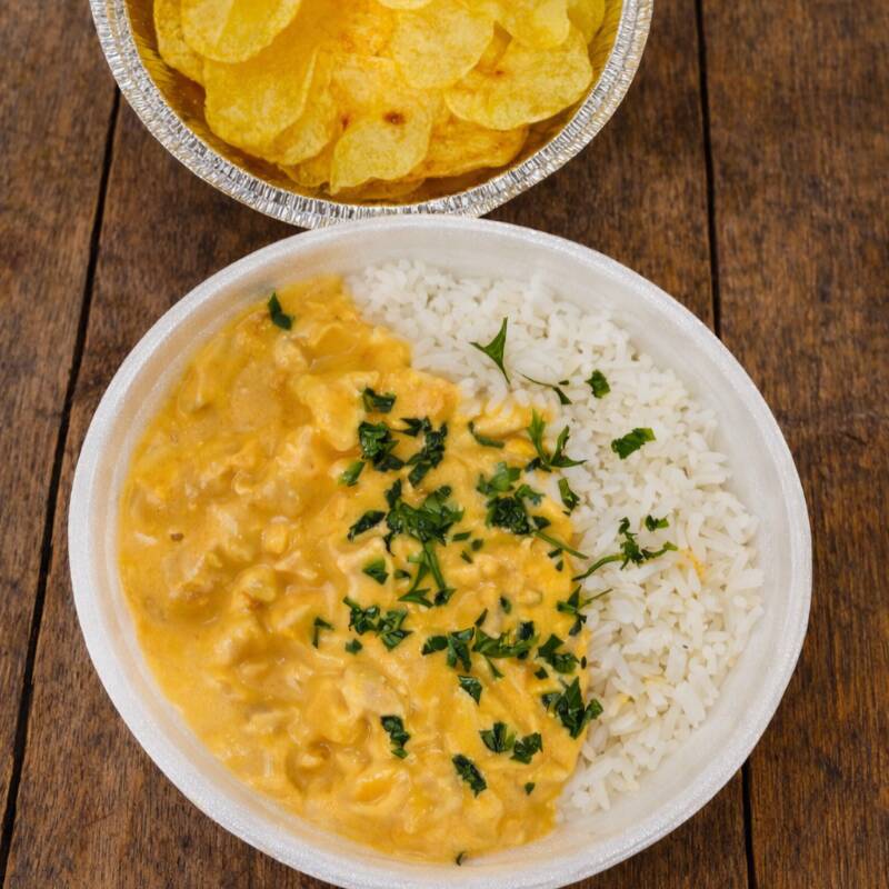 Clássico strogonoff de frango com molho cremoso, servido com arroz branco e acompanhado de batata chips.
