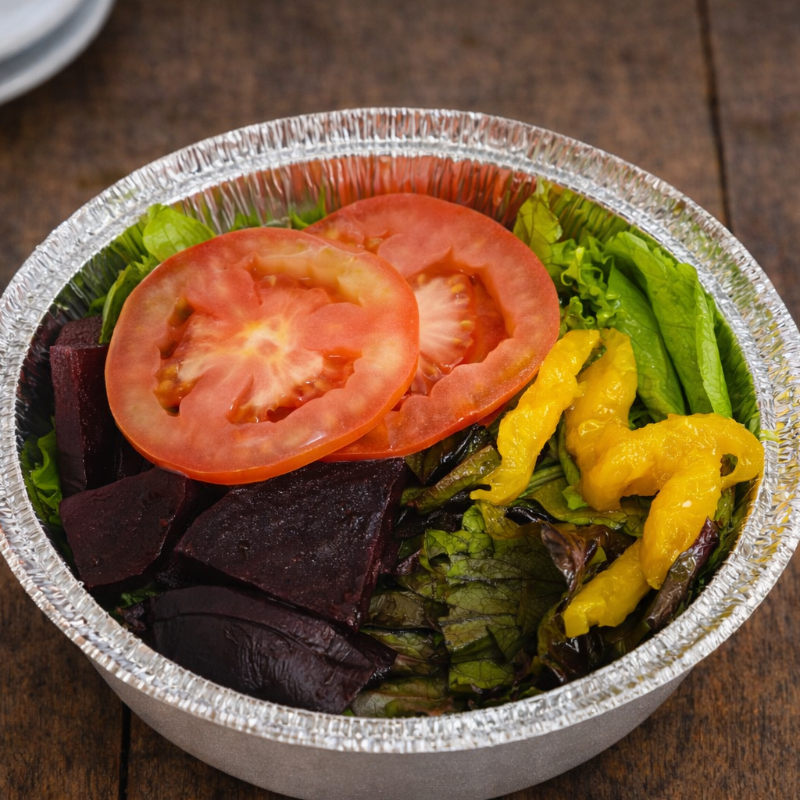 Salada mix com alface roxa, alface crespa, tomate, manga, e beterraba. (aprox. 250g)