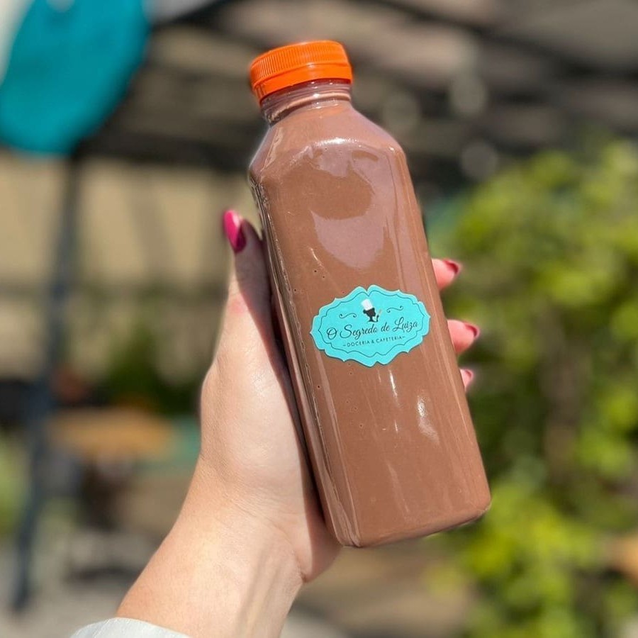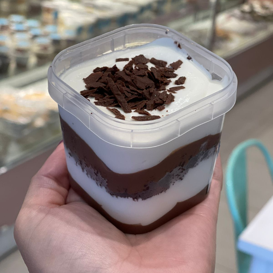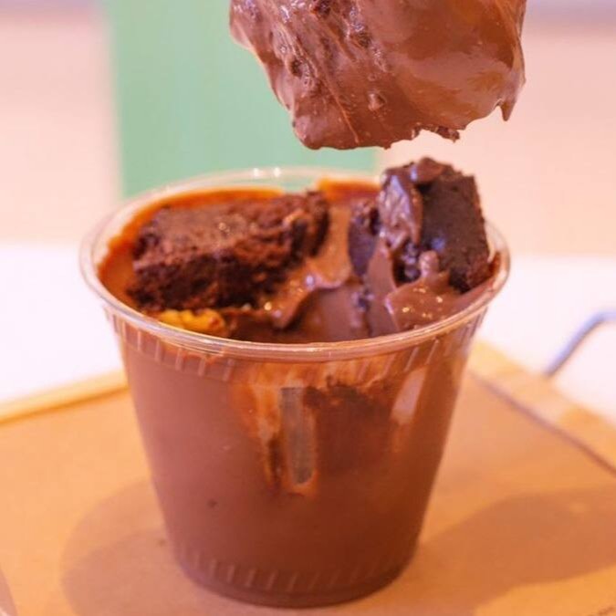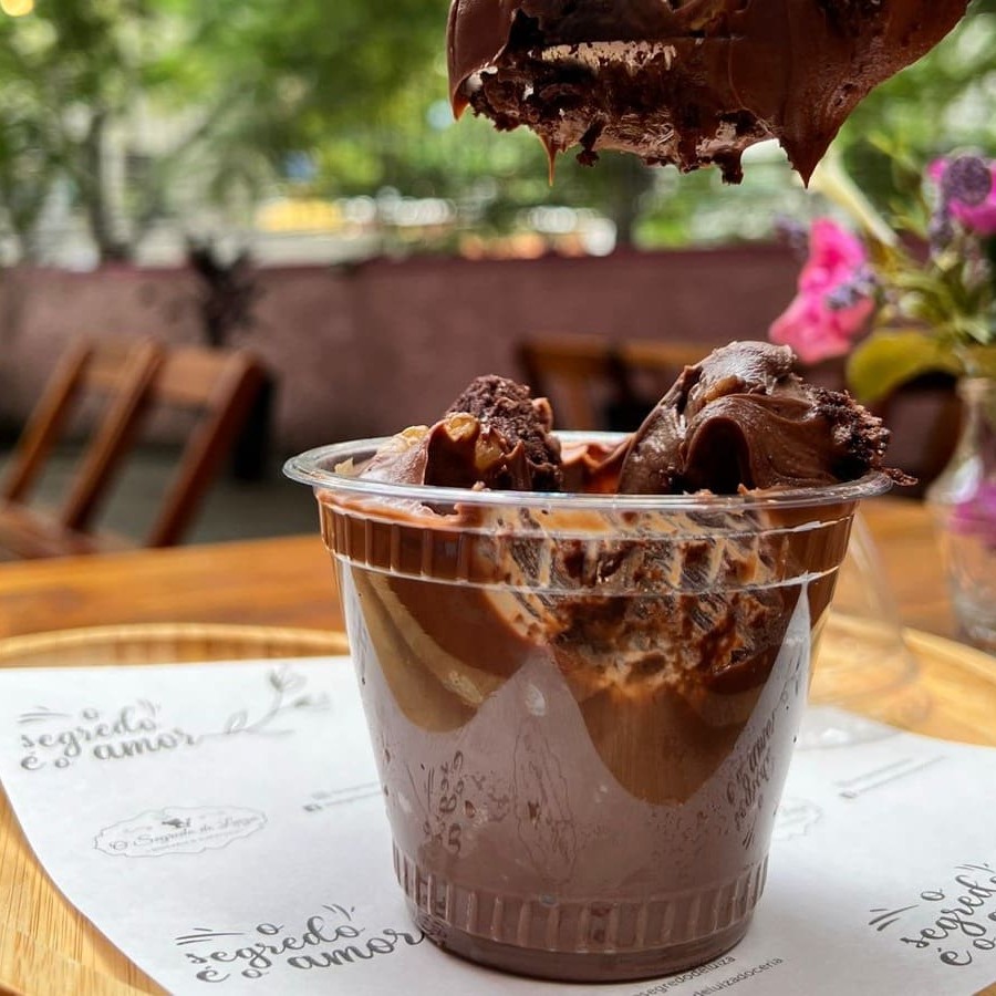 Potinho de bolo de chocolate com camadas de creme de chocolate meio amargo e creme de brigadeiro tradicional