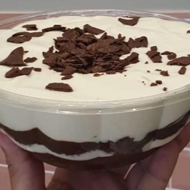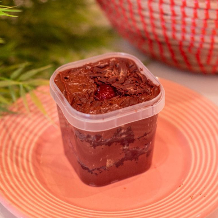 Mousse de leite em pó trufado, pão de ló de chocolate e ganache de chocolate meio amargo. Serve em média de 4 pessoas.