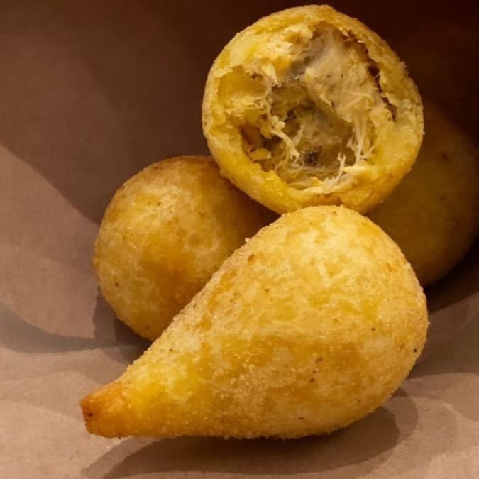 Cone de 5 mini coxinhas de frango sem requeijão.