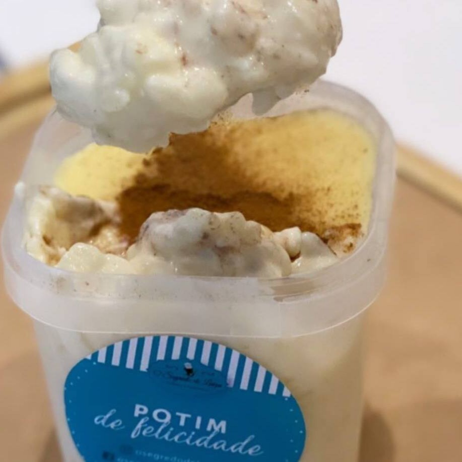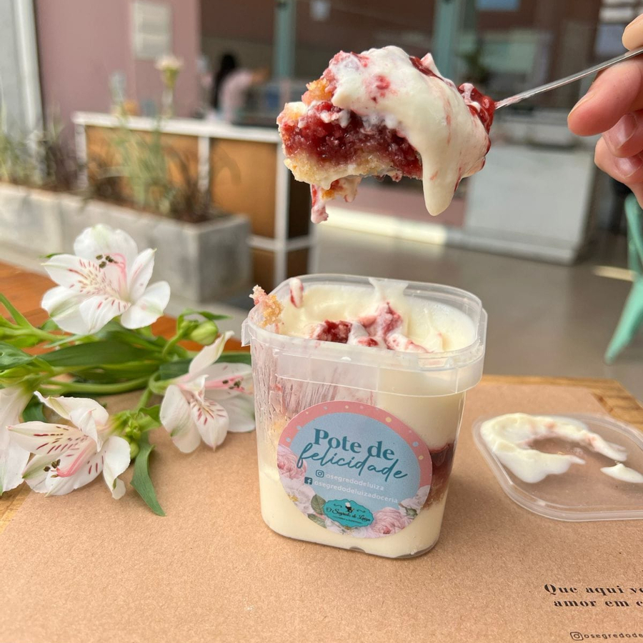 Potinho com mousse de leite em pó, massa de pão de ló e geleia de frutas vermelhas. 220ml.