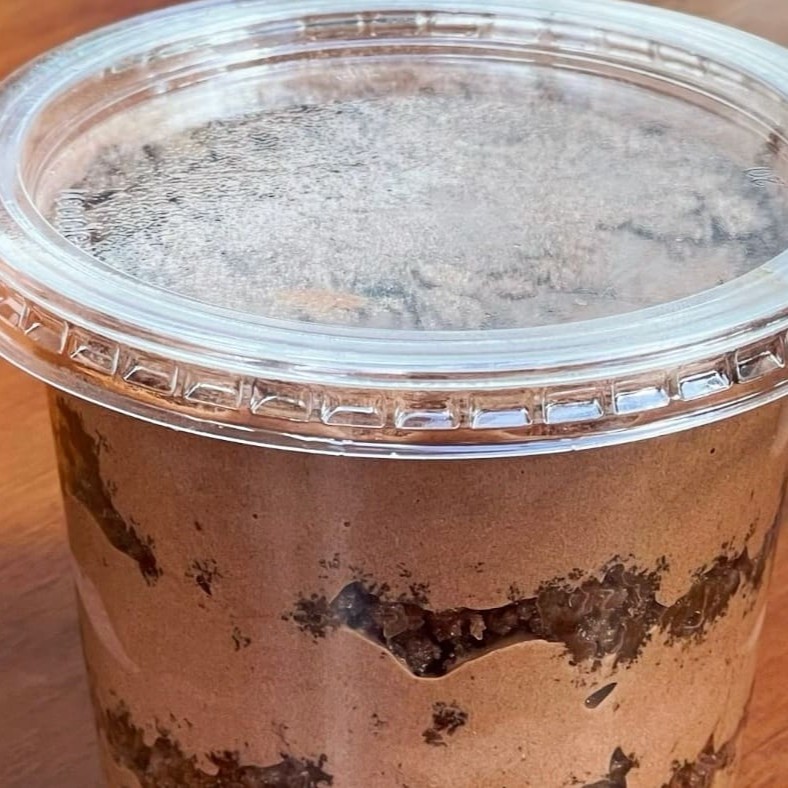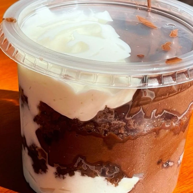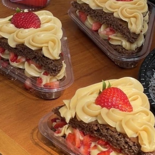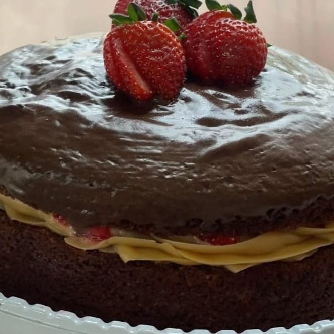 Massa de chocolate molhadinha, com recheio de Ninho, pedaços de morango no meio e calda de chocolate em cima.