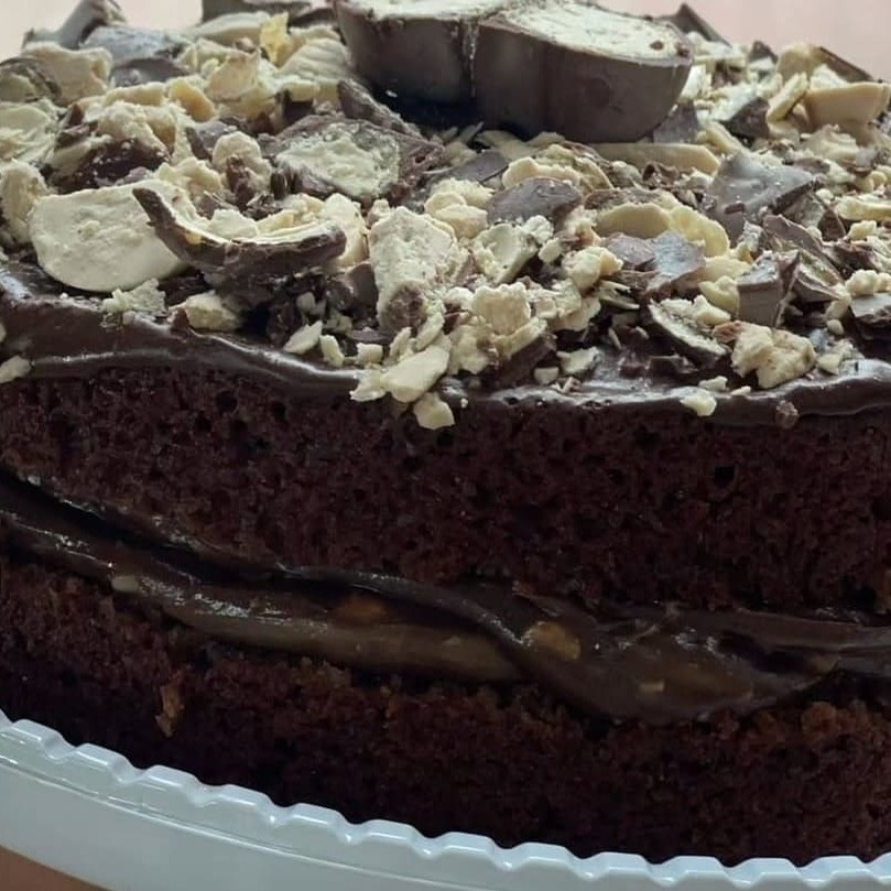 Massa de chocolate molhadinha, com recheio de Sonho de Valsa, calda de chocolate e bombom Sonho de Valsa.