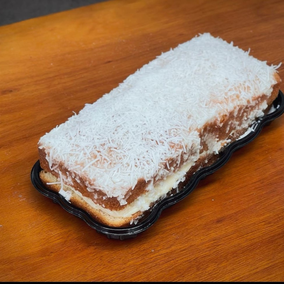 Massa de abacaxi retangular, recheio de coco, bastante calda de coco e pedaços de abacaxi na massa.