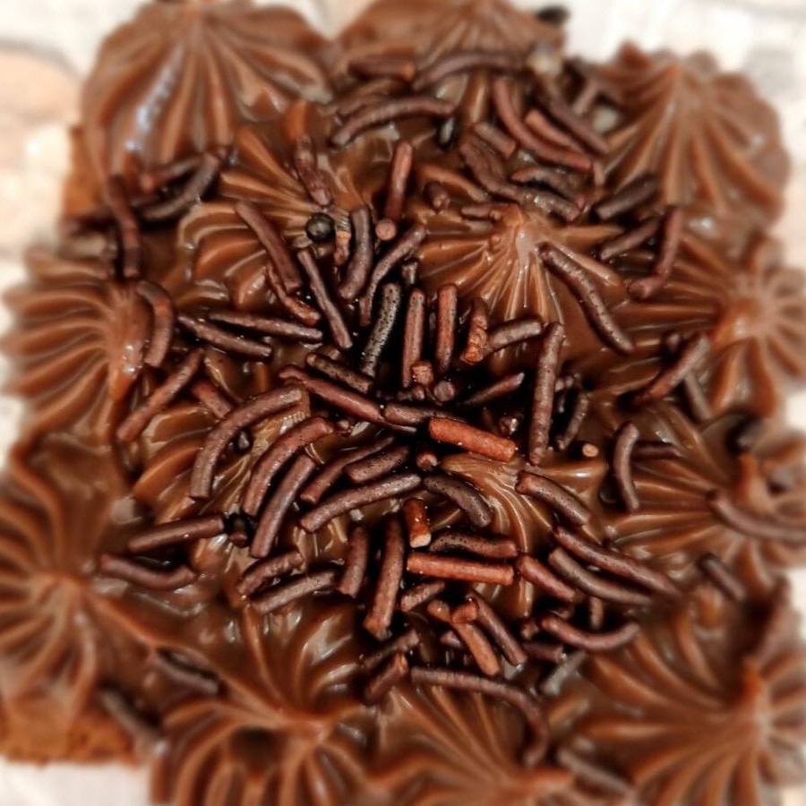Massa de chocolate molhadinha, com recheio de beijinho de coco, calda de chocolate e coco ralado
