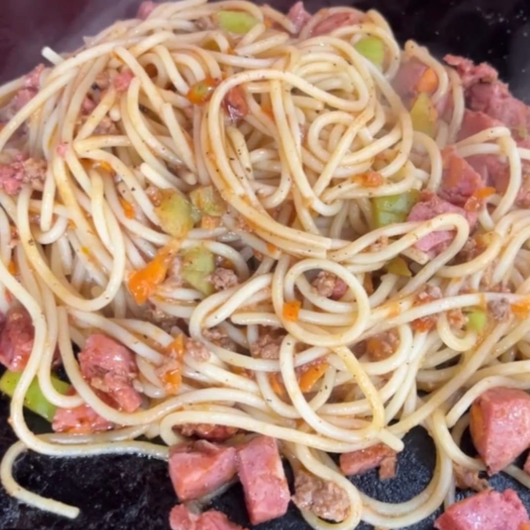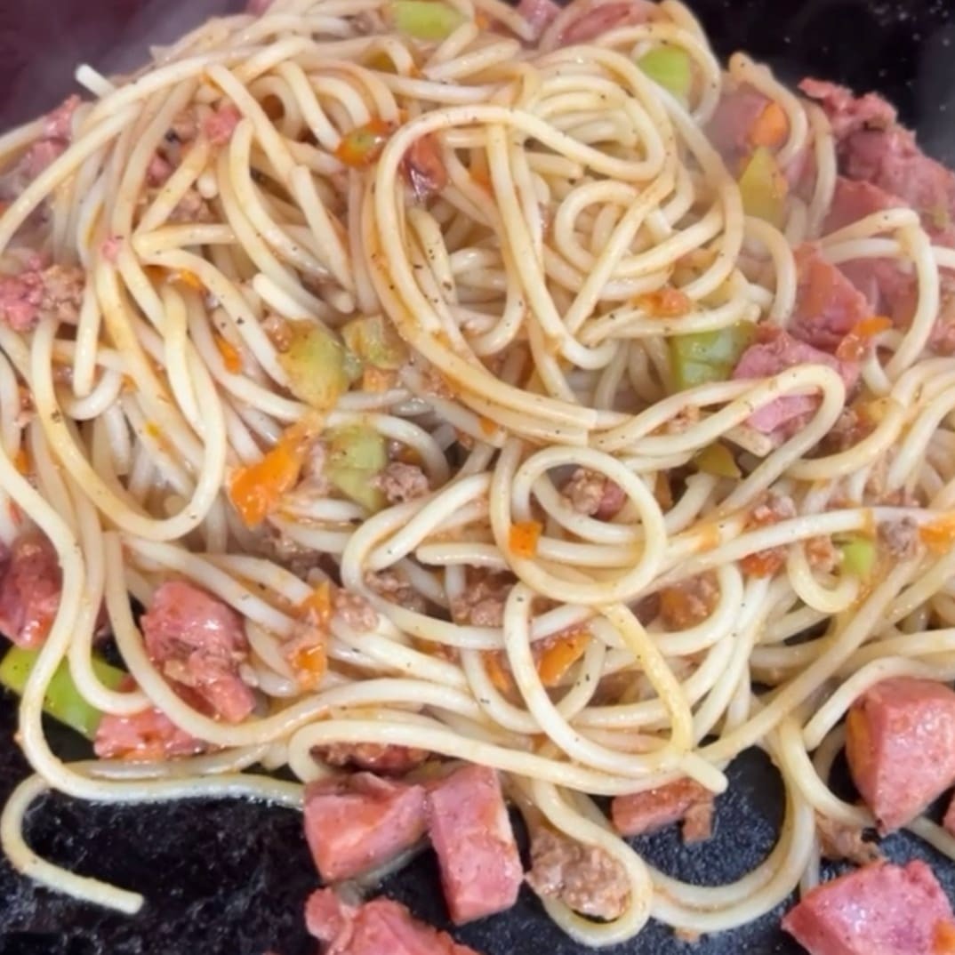 Espaguete, bacon, calabresa, tomate, azeitona, cebola, pimentão, cenoura, cheiro verde, molho à bolonhesa e mussarela.