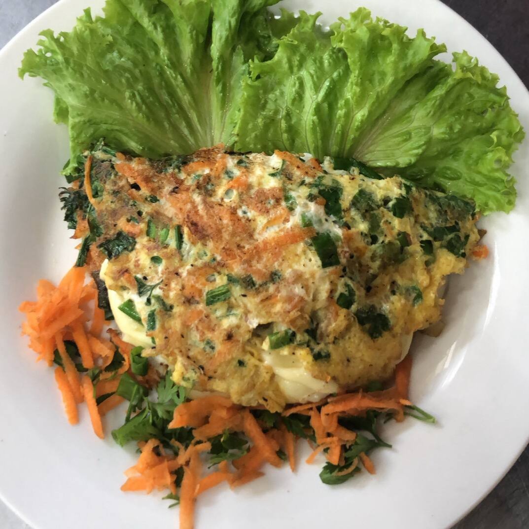 2 ovos, 2 fatias de mussarela, tomate, azeitona, cebola, pimentão, cenoura e cheiro verde.