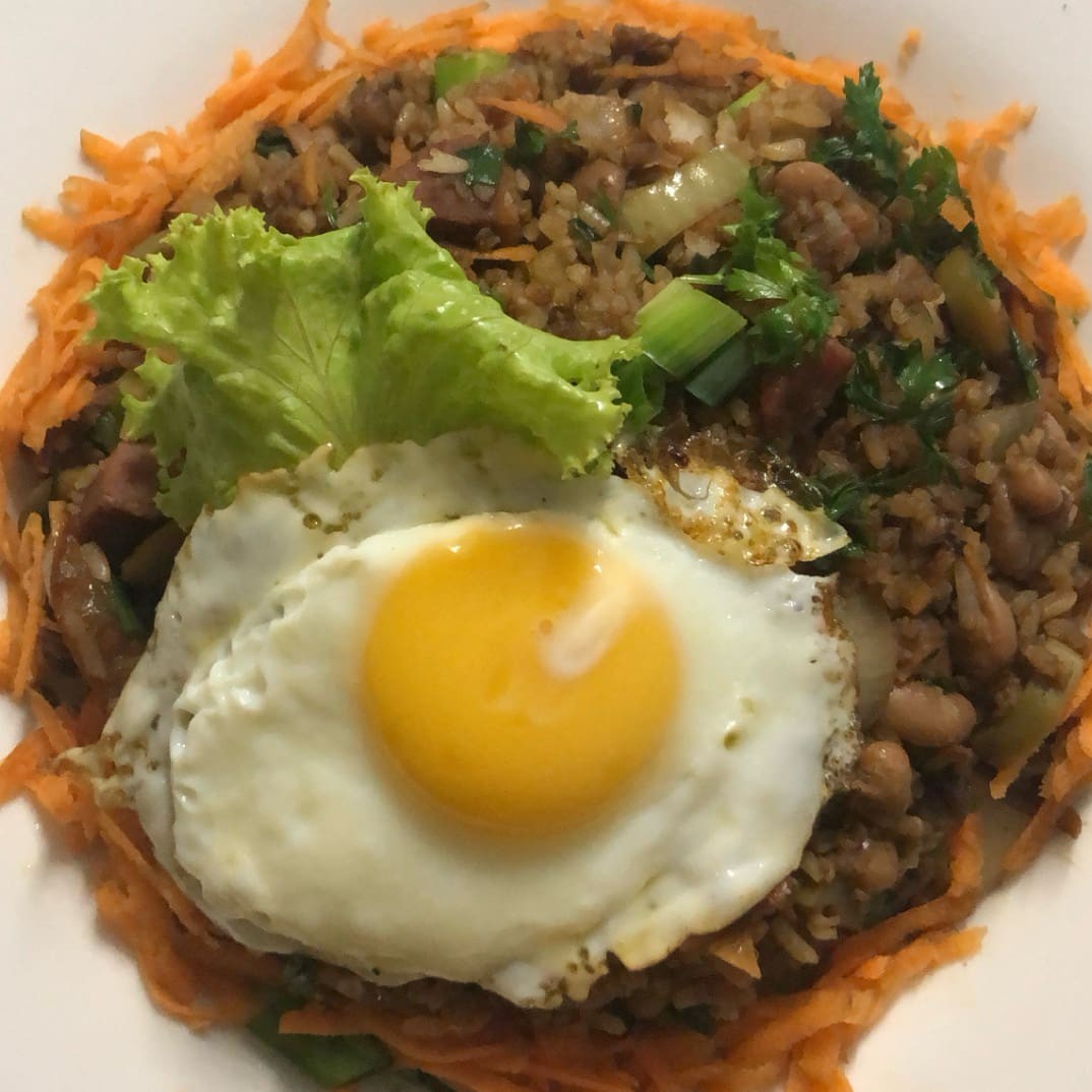 Arroz, feijão, bacon, calabresa, tomate, azeitona, cebola, pimentão, cenoura, cheiro verde e 1 ovo.