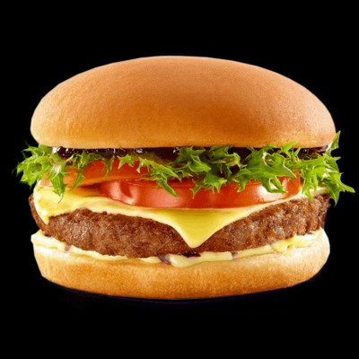 Hambúrguer de boi, queijo, molho, alface e tomate.
