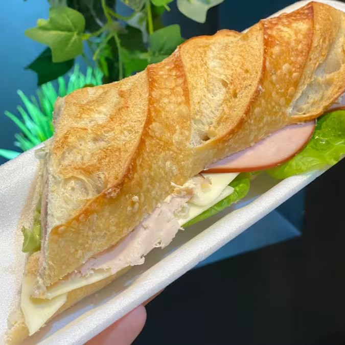Baguete fermentação natural, patê de frango, alface, mussarela e peito de peru/presunto.