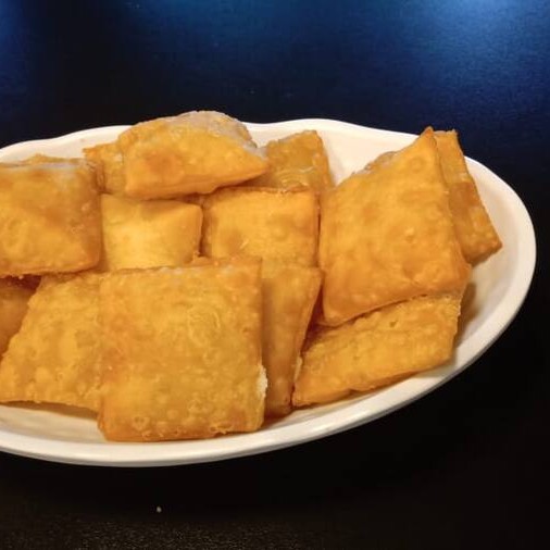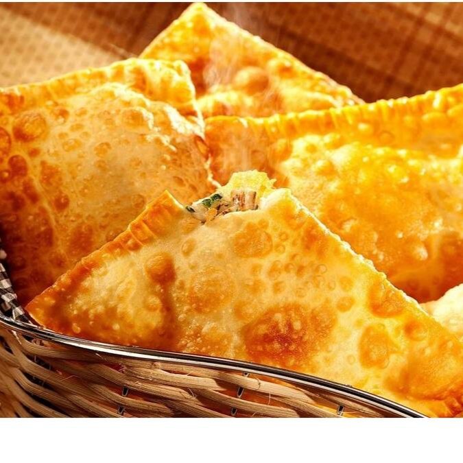 Salgadinho com recheio de 3 queijos frito. 100gr