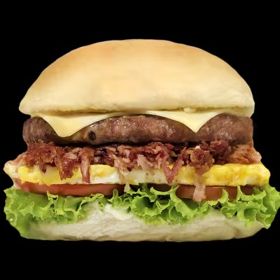 Hambúrguer de boi, queijo, presunto, ovo, molho, alface e tomate.