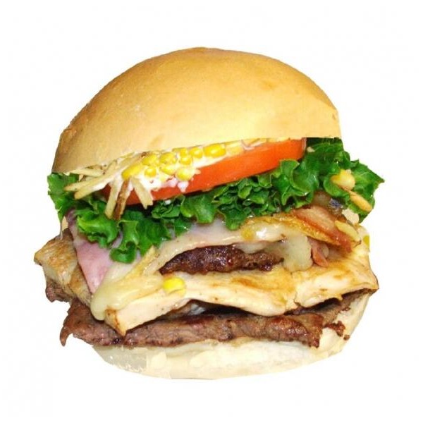 Hambúrguer de boi, queijo, presunto, ovo, bacon, milho, molho, alface e tomate.