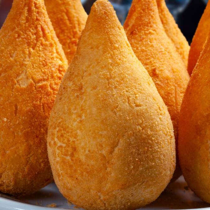 Deliciosa coxinha recheada com frango desfiado e temperado na medida certa, envolta em uma massa leve e crocante.