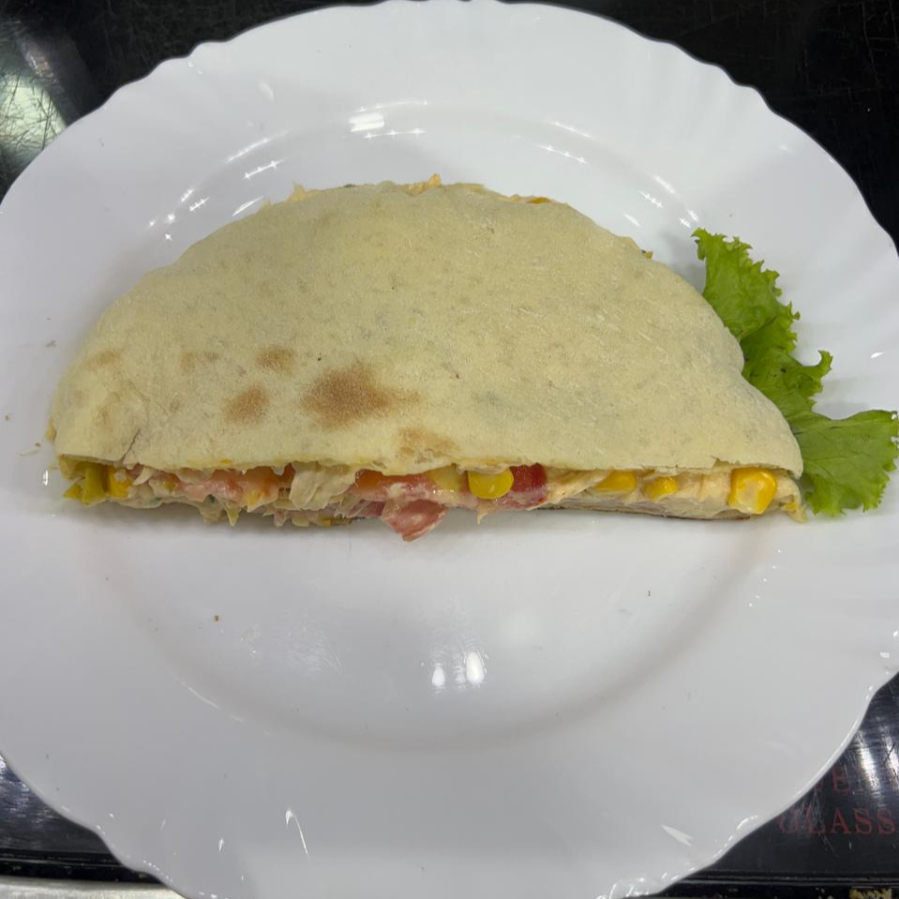 Molho, mussarela, presunto, calabresa, bacon, tomate, milho, azeitona, patê de frango e alface.