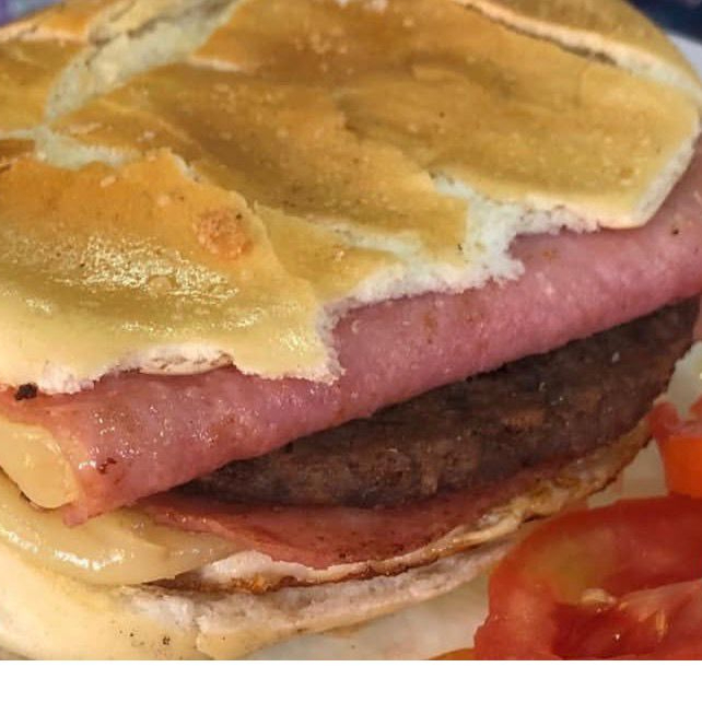 1 pão francês, 2 fatias de presunto, 2 fatias de mussarela, 1 ovo, 1 carne de hambúrguer