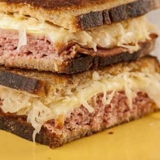 Pão de sal ou de forma, queijo derretido, presunto e carne de hambúrguer