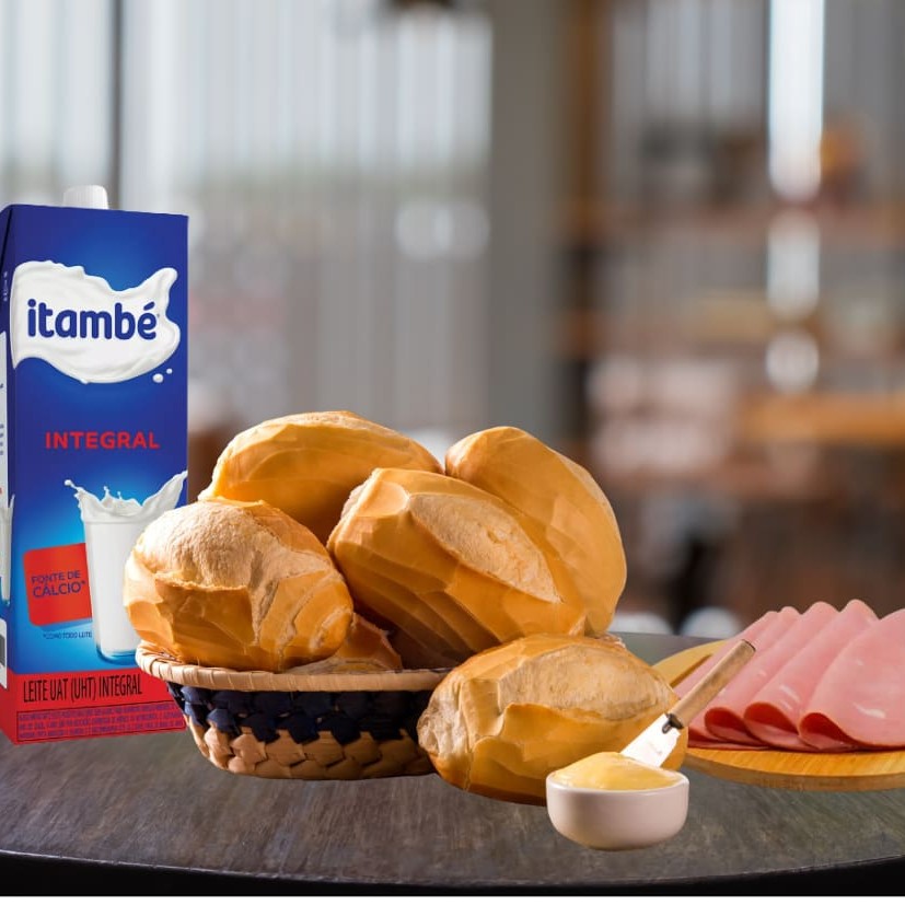 6 pães francês + 100g de mortadela defumada Perdigão + 1l de leite Itambe integral