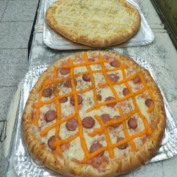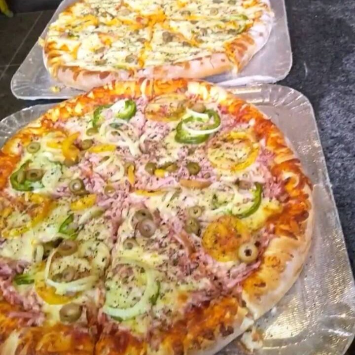 Mussrela, molho, cebola, pimentão, tomate e orégano.