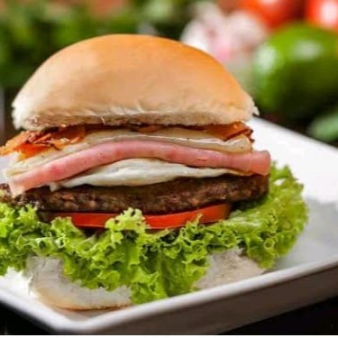 Pão Carne de hambúrguer bovina, Presunto, Mussarela,Ovo , Beicon, Alface ,tomate e batata palha.
