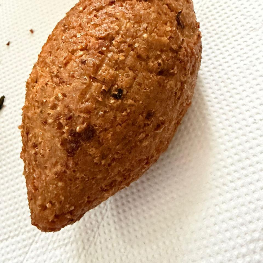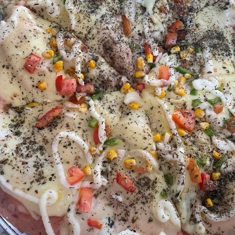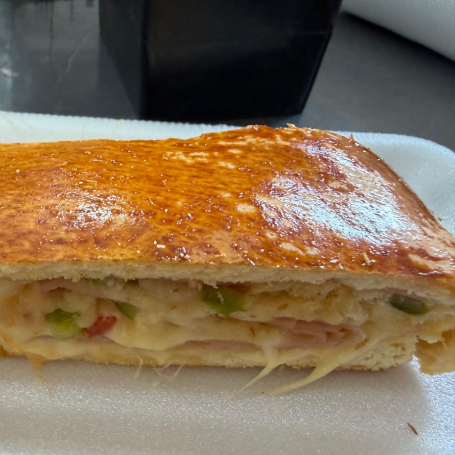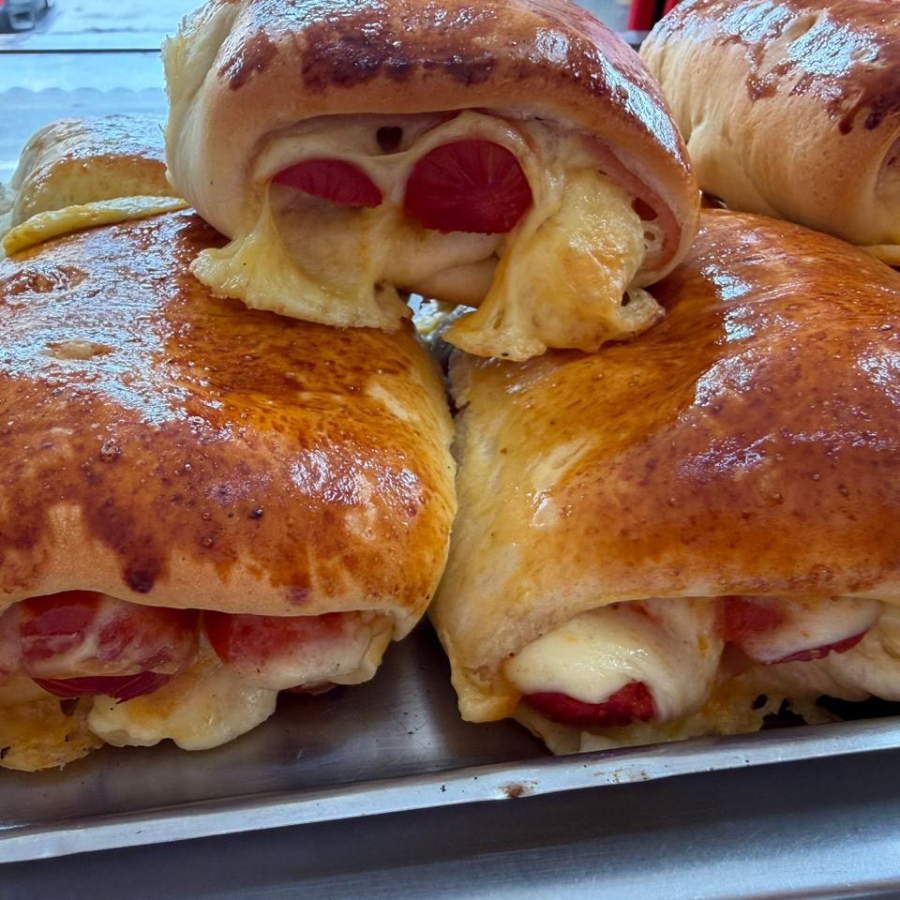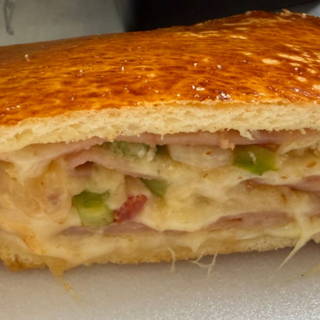 Rocambole rechado com presunto, mussarela, tomate, cebola e pimentão. Envolvida em uma massa de trigo.
